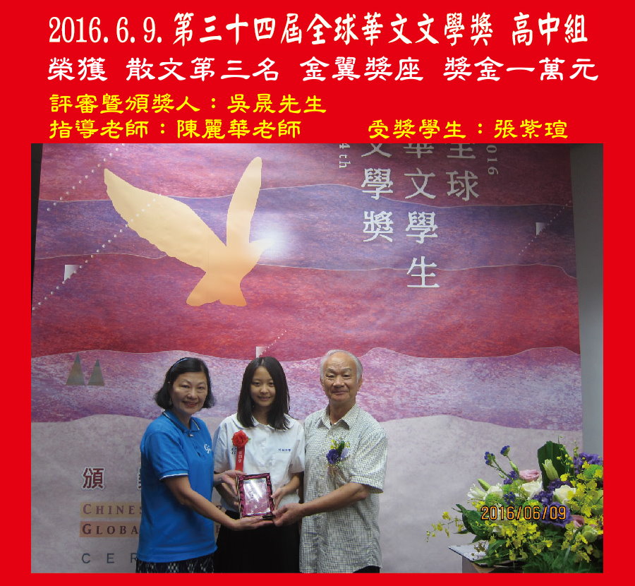 活動專區 / 校外活動 / 104 / 【105.06.09】第三十四屆全球華文文學獎 高中組 散文第三名 金翼獎座 獎金一