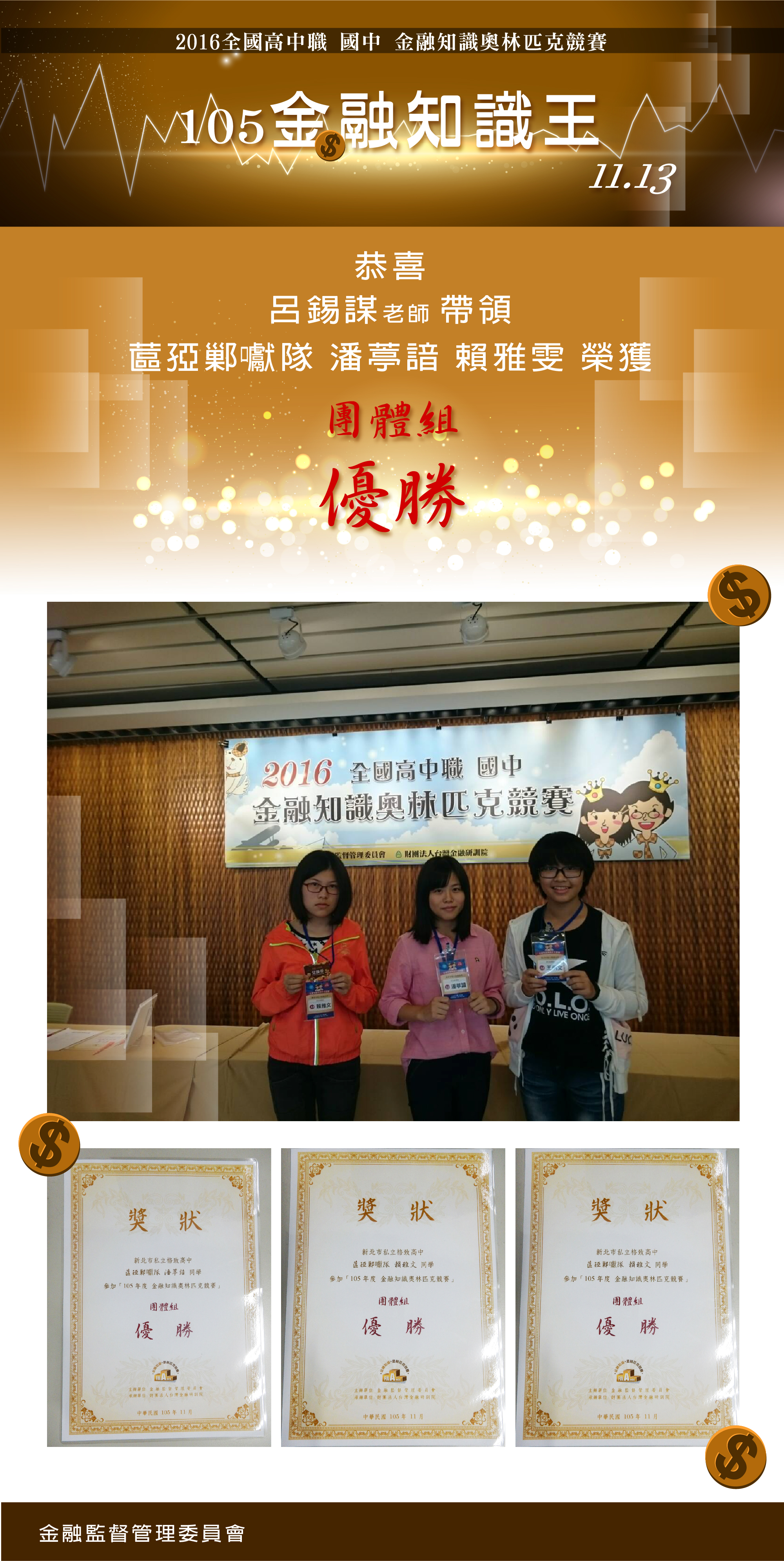活動專區 / 校外活動 / 105 / 恭喜本校資料處理科參加金融知識奧林匹克競賽榮獲~團體組優勝