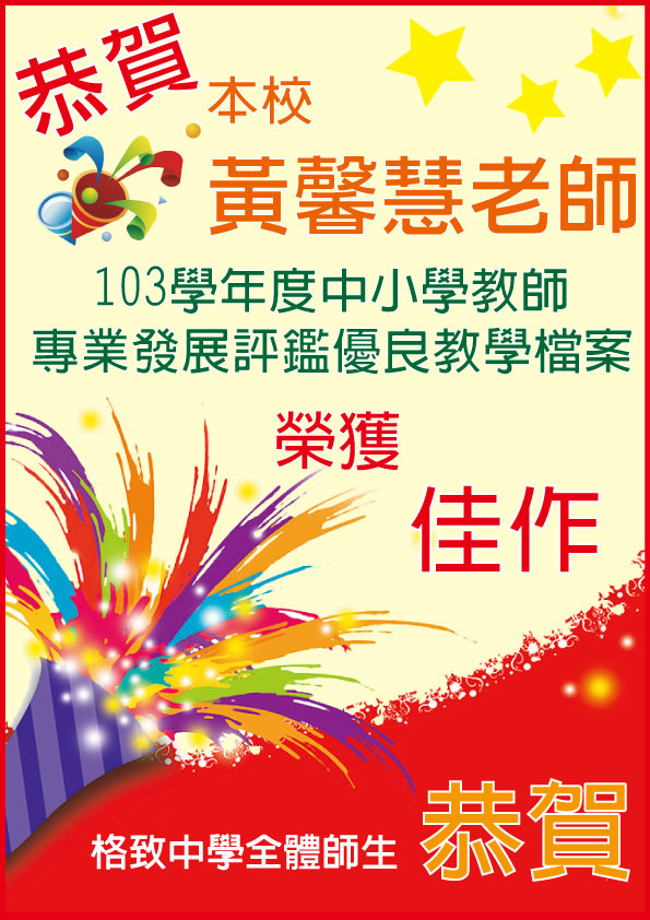 活動專區 / 校外活動 / 105 / 恭賀!!本校黃馨慧老師「103學年度中小學教師專業發展評鑑優良教學檔案徵選計畫」榮獲佳作