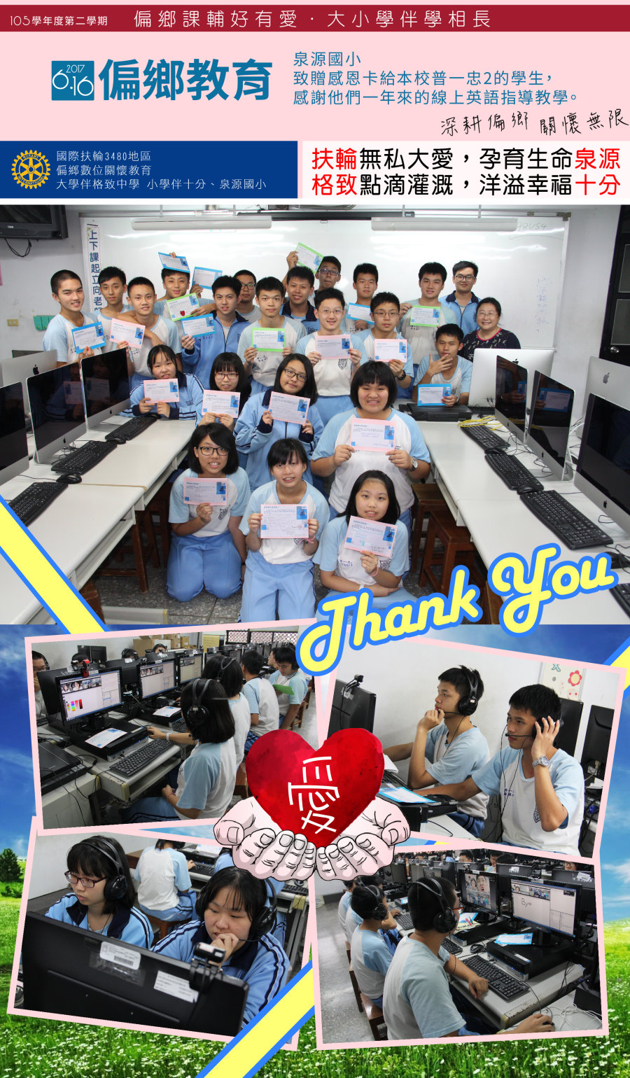 活動專區 / 校外活動 / 105 / 【106.06.16】泉源國小致贈感恩卡給本校普一忠2的學生,感謝他們一年來的線上英語指導教學。