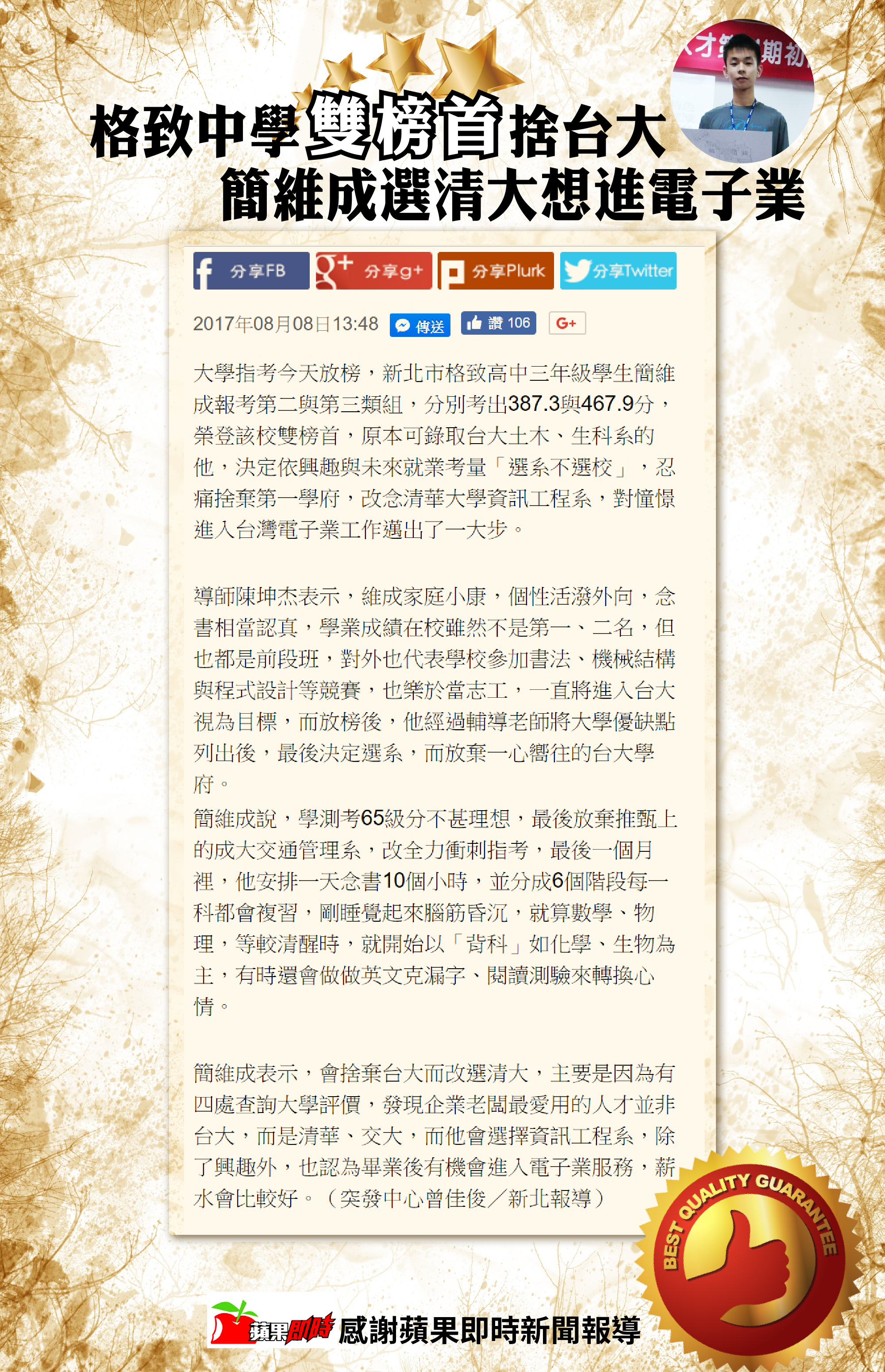 活動專區 / 師生共榮 / 【106.08.09】格致中學簡維成同學捨台大●選讀清大、想進電子業。